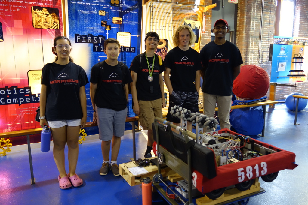 Today, Morpheus attended an FLL summer camp at FIRST Place in Manchester, NH, to talk to campers about FIRST, FRC, and our team. We also demonstrated our 2016 robot, Goatnado, and the campers had a fun time catching the boulder. Additionally, we explained what FRC is and what our team does every season. After the demo, we were excited to investigate the 2014 practice bot of World Champion Team 254 (The Cheesy Poofs). It was neat to see all the innovative design techniques that were employed by one of the most inspirational teams in FIRST. We had a great time presenting at the FIRST Place 2018 FLL summer camp! Thank you for inviting us, FIRST!