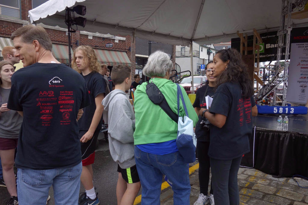 On June 23, 2018, Morpheus participated in a robot demonstration at the 2018 Concord, NH, Market Days in coordination with Team 1721 (Tidal Force). Since it was raining fairly hard, we were glad that there was a tent covering the stage where we would be presenting our robot. Our teams set up a mock scale and a mock climbing bar. We took turns placing cubes in the scale and climbing the rung. While we were demonstrating our robot, our members talked to the community members about FIRST and our teams. Despite the rain, a large crowd was inspired by our robots. We had a great time at Market Days with Team 1721 and hope to return next year.