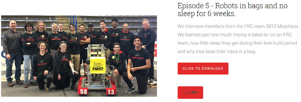 Today's episode of the Robotics for Everyone podcast featured an interview with current and former team leaders about FIRST, our team, and the costs and timeline of a standard FRC season. We had a great time talking to Mr. Falcon and hope to work with him to encourage STEM in the future.